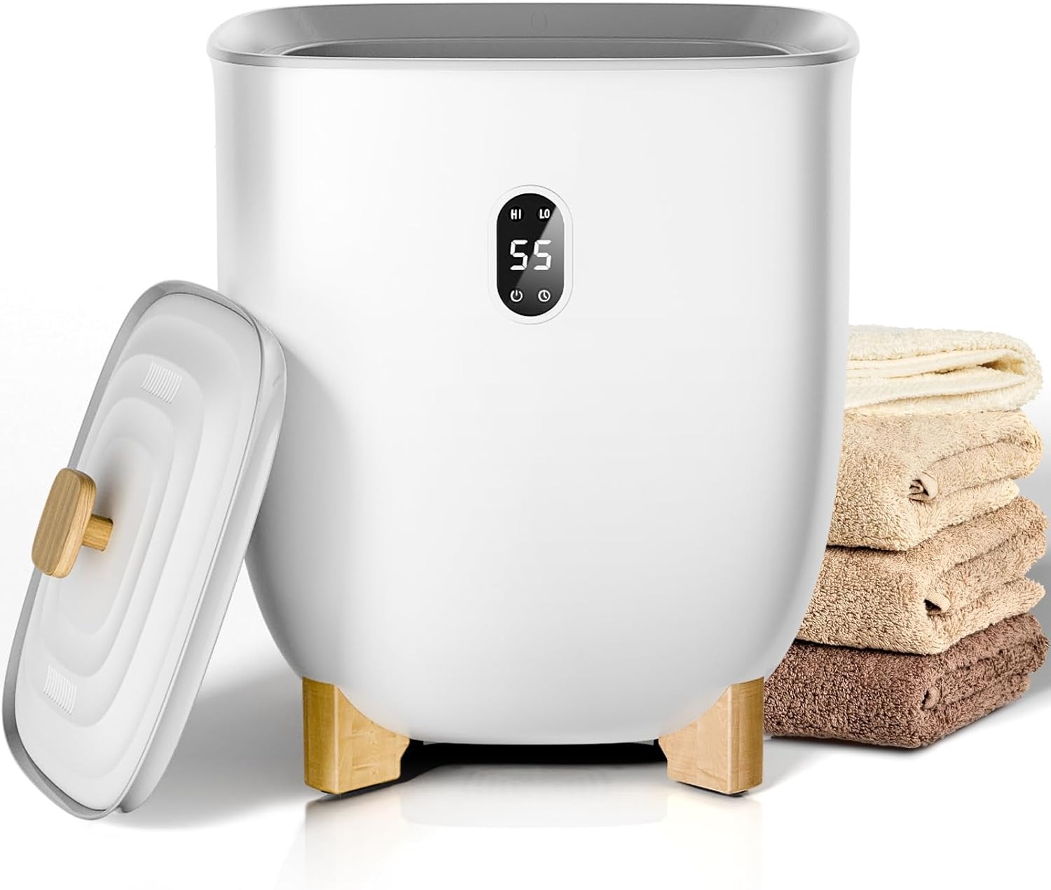 Standing 21 inches tall by 12 inches wide with a 20-liter tub capacity, it accommodates up to two oversized 40″ x 70″ bath towels, robes, blankets, or pajamas.